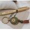 Originale portachiavi in ottone invecchiato, con cabochon di lente d'ingrandimento con quadrante di orologio da tasca in tonalità beige, incastonato in una stella, con pompon in pelle scamosciata marrone chiaro e ciondolo a forma di cuore. Altezza: 10 cm, larghezza: 3,5 cm.