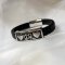Bracelet masculin en cuir tressé épais noir décoré d'une plaque en métal aux 2 coeurs gravés.